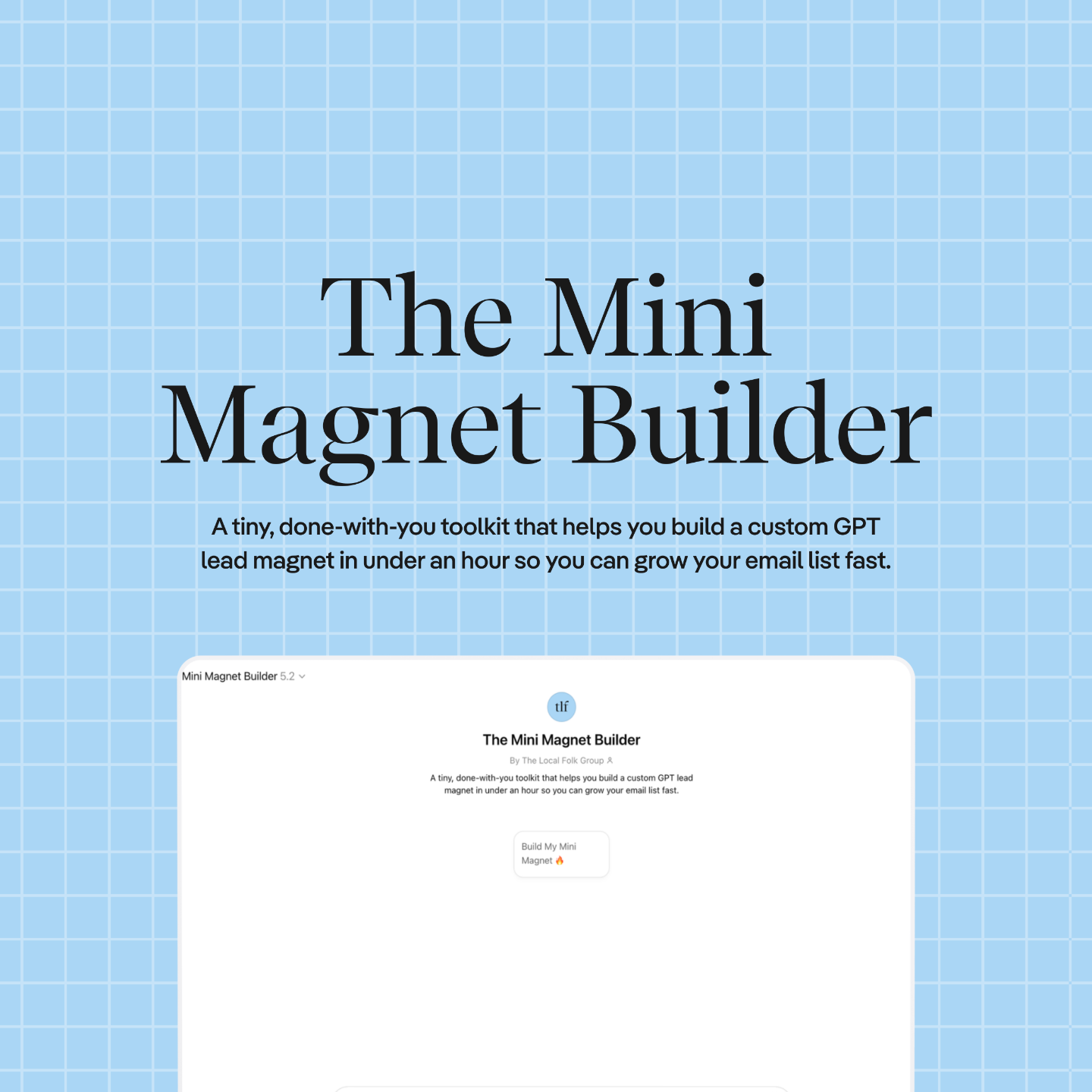 A tiny, done-with-you toolkit that helps you build a custom GPT lead magnet in under an hour so you can grow your email list fast.